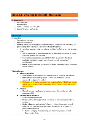 This set of notes included all relevant readings and cases, COLOUR CODED, COMPREHENSIVE, and CLEARLY WRITTEN. Very useful in exams, mid-terms and especially in class for participation. Cases are organised with facts, procedural history, judgement, outcome, and significance. Lecture notes and summaries from a fantastic lecturer are also included for deeper understanding and quick reference in the final exam. I ended up receiving a distinction mark for my final exam using this set of notes :) The relevant textbooks: - Robertson & Paterson, Contract: Cases and Materials (14th ed, Thomson Reuters, 2020) (the Casebook) - Robertson & Paterson, Principles of Contract Law (6th ed, Thomson Reuters, 2020) (the Textbook) The topics included: - Express terms - Implied terms - Termination (by agreement, by breach, repudiation) - Frustration - Damages for breach of contract (expectation damages, rectification, loss of a chance) - Vitiating factors (Recission, misrepresentation, mistake, undue influence, misleading or deceptive conduct, duress, unconscionable dealing, unconscionable conduct)