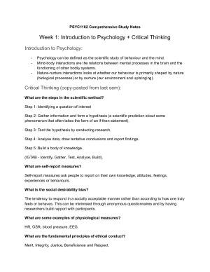 Highly detailed PSYC1102 notes from Sem 2 2022. Topics Covered: 1. Introduction to Psychology and Critical Thinking 2. Language and Thinking 3. Developmental Psychology 4. Health and Wellbeing 5. Psychological Disorders 6. Treatment of Psychological Disorders 7. Intelligence 8. Personality 9. Social Psychology 10. Indigenous and Cross-Cultural Psychology