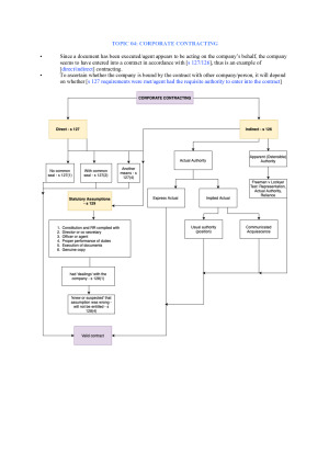 These notes enabled me to get a high HD (85) at the final exam. - Includes all topics from week 1 - 12. - Compilation of readings, lecture notes, case extracts and most importantly, quick summaries of all the lengthy legislation extracts covered in the course content - Colour coded topic-wise, clean, easy-to-navigate format. - Includes easy to follow flowcharts and diagrams for complicated topics - Director's Duties, Corporate Contracting etc. List of Topics: 1) Introduction to Corps Law 2) Incorporation and Effects 3) Constitution and Replaceable Rules 4) Corporate Contracting 5) Share capital, debt and dividends 6) Corporate Decision Making 7) Directors' Duties 8) Members' Remedies