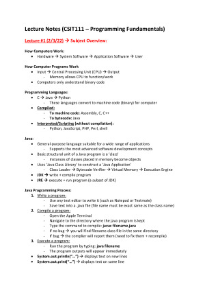 Summarised lecture notes for CSIT111 Programming Fundamentals over 12 weeks for students to easily understand the subject's theory with relevant examples. Topics include: - Subject Overview - Object Oriented Programming - Anatomy of a Java Program - Java Data Types - Java Methods - Java Classes and Objects - Program Control – Sequential Execution - Selection Statements - Relational and Logical Operators - Repetition Statements - Method Call & Method Overloading - Recursion - Arrays - ArrayList and Collections/Lists - Testing, Debugging, Package, API - Case Study (A Simple To-Do-List)