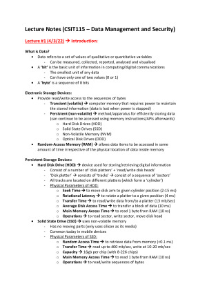 Summarised lecture notes for CSIT115 Data Management and Security over 12 weeks for students to easily understand the subject's theory with relevant examples. Topics include: - Introduction - Database Design - Object Data Model - Conceptual Modelling - Relational Data Model - Logical Design - Database Design Quality - Structured Query Language (SQL) - Data Definition Language (DDL) - Data Manipulation Language (DML) - Select Statement [1] - Select Statement [2] - Select Statement [3] - Select Statement [4] - Select Statement [5] - Views - Advanced DDL & DML Statements - Architecture of Relational Database Server - Database Security - Discretionary Access Control - User Management - Data Integrity - Data Vulnerabilities - Database Auditing - Data Privacy - Legal and Ethical Issues in Data Management