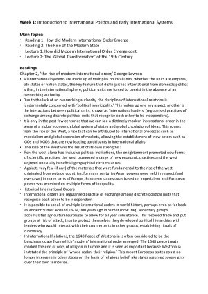 Notes from every week of the class including detailed lecture notes and highly detailed summaries of the required reading for every week of the course. Topics covered are: Introduction to International Politics Early International Systems The Cold War Realism Liberalism Normativity in International Relations Critical Theory and International Relations International Law Human Rights The United Nations and Global Governance Transnational Issues War and Political Violence