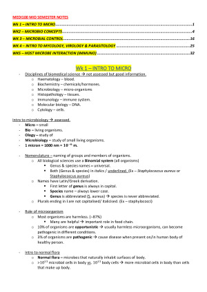 These notes contain everything you need for the theory mid-semester exam (based on lecture content only). The laboratory component is assessed in the lab based on knowledge from previous labs. It covers 5 weeks of content. I got 90% on this assessment by using my notes instead of lecture slides. Each week's content has a heading and it includes only what is needed for the assessment. Table of contents: - Introduction to microbiology - Microbiology concepts - Microbial control - Introduction to mycology, virology & parasitology - Host-microbe interaction (immunology)