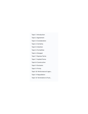 - Textbook notes from Paterson and Robertson for each topic (~123pgs): includes every topic covered from the textbook 3x Weeks of Quiz Summaries (~38pgs) - introduction - Agreement - Consideration - Certainty - Intention - Formalities - Estoppel - Express Terms - Implied Terms - Construction - Exclusion - Privity - Discharge: by performance and agreement - Discharge by Repudiation - Termination and Frustration Achieved a HD in the subject with the notes.