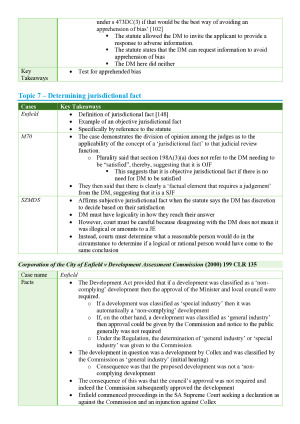An extensive overview of all cases for Admin Law. Each case has key facts, issues, decision, reasoning and key takeaways. The structure of the notes is based on the topics covered. Topics included: 1. Introduction into Admin Law 2. Administrative Law reforms 3. Standing 4. Jurisdictional error 5. Procedural fairness - Hearing Rule (Grounds) 6. Procedural fairness - Bias Rule (Grounds) 7. Determining Jurisdictional fact (Grounds) 8. Acting without legal authority (Grounds) 9. Invalid delegation of power (Grounds) 10. Considerations (Grounds) 11. Inflexible application of policy (Grounds) 12. Unreasonableness (Grounds) 13. Privative clauses and other limitation devices 14. Invalid legislation delegation 15. Human Rights in Admin review For a more comprehensive understanding of the cases used in Admin Law, purchase H1 Admin Law FULL SEMESTER NOTES 2023. For a summarised template to use for the exam, purchase H1 Admin Law EXAM NOTES 2023.