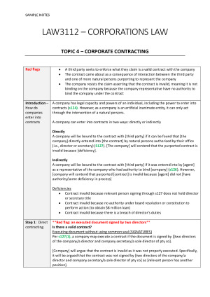 This comprehensive script helped me achieve a HD for my exam and the overall unit! It condenses the overwhelming and complex content into simple, concise sentences for ease of use in stressful exam conditions. I have also incorporated examples to prompt speedier problem identification, following ideal tutorial answer outlines and CE exam answer guides. Most issues have been considered and integrated into these notes, however, may be subject to changes to the unit curriculum. TOPICS INCLUDED - Topic 1: Introduction to Corporations Law - Topic 2: Incorporation and its Effects - Topic 3: The Constitution and the Replaceable Rules - Topic 4: Corporate Contracting - Topic 5: Share (Equity) Captial, Debt Captial and Dividends - Topic 6: Directors, Members and Corporate Decision Making - Topic 7: Directors' Duties - Topic 8: Consequences of Contravention and Relief from Liability - Topic 9: Members' Remedies Note - Ch 2E: Related Parties' Transactions and Topic 10: Corporate Mortality are excluded.