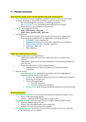 Topics include: - Overview of marketing - The marketing environment - Marketing information - Buyer behaviour - Segmentation, targeting and positioning - Product decisions and branding - Pricing decisions - Promotion decisions - Distribution decisions - Services and extended marketing mix - Digital, social and not-for-profit marketing - Marketing planning, implementation and evaluation