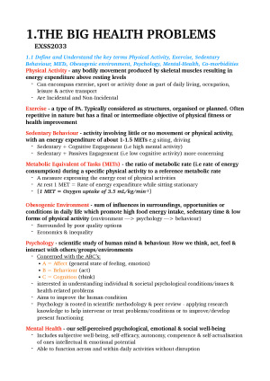 EXSS2033 [Psychology of Exercise and Physical Activity] full comprehensive notes inclusive of all weeks - a subject of which I scored a high distinction All topics included: 1. The Big Health Problems 2. The Intention Behaviour Gap/Scaling Psychometrics/Psychology of Ex/PA 3. Correlates of Exercise/Physical Activity Behaviour/Individual Motivation 4. Stage Based behaviour change: The Transtheoretical Model 5. Measurement of Ex/PA & Sedentary Behaviour 6. Supporting Behaviour change: BCTs 7. Motivational Interviewing 8. Habits in Ex/PA Behaviour change 10. Ex/PA & Mental Health: The 'Feeling Good' Effect 11. Ex/PA & Mental Health: treating stress & anxiety 12. Issues & Challenges related to exercise dependance