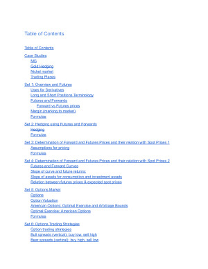 Unlock Derivatives Mastery with These Comprehensive and Example-Rich Lecture Notes! Welcome to the ultimate guide for conquering derivatives like a pro! π These notes are your secret weapon, filled with real-life case studies, practical examples, and powerful formulas to make you a derivatives superstar! TABLE OF CONTENTS: 1. Case Studies: MG, Gold Hedging, Nickel Market, Trading Places π 2. Set 1: Overview and Futures - Uses for Derivatives - Long and Short Positions Terminology - Futures and Forwards - Forward vs. Futures Prices - Margin (Marking to Market) - Handy Formulas 3. Set 2: Hedging using Futures and Forwards - Hedging Strategies - Must-Know Formulas 4. Set 3: Determination of Forward and Futures Prices and their Relation with Spot Prices 1 - Key Assumptions for Pricing - Essential Formulas 5. Set 4: Determination of Forward and Futures Prices and their Relation with Spot Prices 2 - Exploring Futures and Forward Curves - Understanding Slope of Curve and Future Returns - The Relation between Futures Prices & Expected Spot Prices 6. Set 5: Options Market - All About Options - Option Valuation Techniques - Optimal Exercise and Arbitrage Bounds for American Options - Must-Have Formulas 7. Set 6: Options Trading Strategies - Mastering Option Trading Strategies - Bull Spreads, Bear Spreads, Box Spread, Butterfly Spread, Reverse Butterfly Spread, Calendar Spread, Straddle, Strangle, Strip, StrapβOh My! 8. Set 7: Binomial Pricing Model - Navigating Binomial Trees - A Real Call Option Example with a Riskless Portfolio - Handy Formulas 9. Set 8: Black Scholes Model - Understanding the Assumptions - The Magical Lognormal Property - Handling Volatility and VIX Index - Including Dividends in BSM - Valuing European Currency Options with BSM - Stock Index Options & Valuation with BSM - American Options and BSM Model - Binomial vs. BSM: The Showdown - Essential Formulas 10. Set 9: The Greeks - Hedging Options Positions - Leveraging the Greeks for Hedging: Delta, Gamma, Theta, Vega, Rho - Formula Sheet for Quick Reference These notes are your golden ticket to derivatives success! From fundamentals to advanced strategies, we've got your back. Plus, guess what? With these notes, I aced the subject and scored an impressive 97% in my final grade!