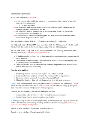 These notes were used to achieve a HD in the exam. It is optimised to suit the take home exam structure. It also provides tips for the exam and detailed case summaries at the end. Good luck! :) These notes cover: - Intestate Succession - Will and Will Making - Mental Requirements for Will Making - Statutory Wills - Execution Requirements - Exceptions to Execution Requirements - Changing a Will - Interpretation of Wills - Gifts by Will - Family Provision - Personal Representatives - Grants of Representation - Case summaries - Functions and Duties of Personal Representatives - Powers, Rights and Liabilities of Personal Representatives