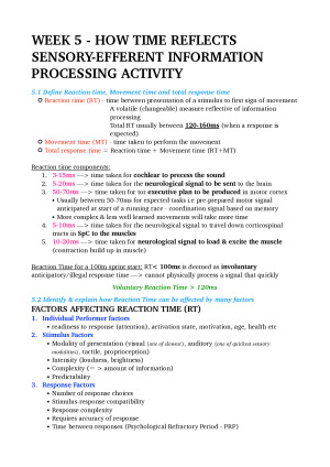 EXSS3062 Full Comprehensive Notes of which I received a HD in Inclusive of both Motor Learning and Motor Control sub-topics Topics Included: 1. Motor Control and Learning Intro 2. Goal Setting in Motor Learning 3. Motivation, Attention, Stress, Arousal in Motor Performance & learning 4. Augmented Feedback 5. Practise 6. Modelling & Observational Learning 7. Motor learning and Development in Childhood 8. Automaticity, Expertise & Adaptations 9. Error in skill, Techniques of Error Correction & Preventing Errors 10. Conscious & Automatic Control of Motor Behaviour 11. Acquiring Information: Sensory Proprioception 12. Sensory Input: Balance & Vision 13. How time Reflects Sensory-Efferent Information Processing Activity 14. Attending to Sensory Information 15. Memory & Information Storage 16. Hierarchy, Coordination & Synergies 17. Motor Units & Muscle Force Recruitment