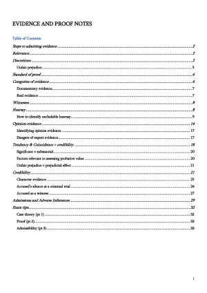 detailed notes on the topics regarding admissibility Steps to admitting evidence Relevance Discretions -Unfair prejudice Standard of proof Categories of evidence -Documentary evidence -Real evidence Witnesses Hearsay -How to identify excludable hearsay Opinion evidence -Identifying opinion evidence -Dangers of expert evidence Tendency & Coincidence + credibility -Significant v substantial -Factors relevant to assessing probative value -Unfair prejudice v prejudicial effect Credibility -Character evidence -Accused’s silence at a criminal trial -Accused as a witness -Admissions and Adverse Inferences Exam tips Case theory Proof Admissibility
