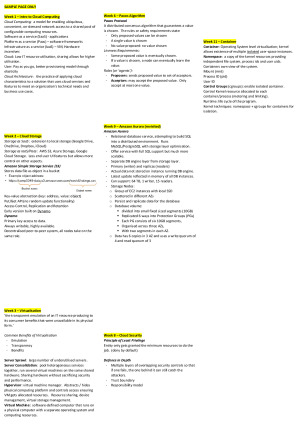 Topics (Weeks 1 - 12): - Cloud Storage - Virtualisation - Amazon EC2 - Cloud Databases (Google Spanner) - Amazon Aurora - Cloud Networking - Paxos Algorithm - Cloud Security - Containers (Docker, Kubernetes) Includes extra notes from various internet sources to help with understanding of complex concepts. Publicly available diagrams provided to assist with understanding. Using a standard structure that makes following and looking up topics easier and faster.