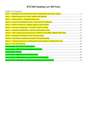 These are the notes for BTF3601 Banking Law at Monash Uni. They cover all the course content across the twelve topics taught in the unit (See contents below). The notes also include the most helpful resource that I created - answer guides to key areas of questions. These guides step you through how to answer each in order to ace tests and exams. These notes and answer guides helped me achieve a HD in the unit, and helped me to ace the exam and reinforce my learning. All the best! CONTENTS: Week 1 – Introduction to the legal framework governing banking and finance industry Week 2 – Global Financial Crisis (GFC) and Post-GFC Reforms Week 3 – Financial Advice – Regulatory Framework Week 4 – Using AI in the Financial Sector – Robo Advisers and Beyond Week 5 – The Rise of FinTech – Sandbox Approach and Neo-Bank Week 6 – Consumer Lending Part I – NCCPA & Truth in Lending Week 7 – Consumer Lending Part II – NCCPA & Best Interests Duty Week 8 – ASIC’s Product Intervention Power (s1023D CA) and APRA’s BEAR (P IIAA BA) Week 9 – Introduction to Property Law & Secured Lending Week 10 – Anti-Money Laundering & Counter Terrorism Financing Week 11 – Financial Transactions and Payments System (Cheques and ePayments Code) Week 12 – New Developments Answer Guide – Provision of financial advice Answer Guide – Digital Advice (Regulatory Framework) Answer Guide – NCCPA Answer Guide – ASIC Product Intervention Power Answer Guide – APRA Banking Executive Accountability Regime Answer Guide – Anti Money Laundering and Counter Terrorism Financing