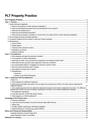 BENEFITS OF THESE NOTES - These notes cover every examinable topic for the College of Law Practical Legal Training Property Practice oral assessment (including the tasks that are required to be submitted prior to the oral); - These notes are based on feedback from lecturers on activity submissions and the practice papers supplied by the College of Law; - You can simply just read from these notes when responding to questions asked of you; and - Hyperlinked table of contents and headings will make it easy for you to swiftly navigate through these notes during the exam. Topics covered include (see the table of contents for further detail): - Vendor disclosure legislation - Pre-exchange and post-exchange searches - Purchaser's default - Pre-settlement - Settlement and post-settlement - Knowledge of the practice area - Ethics and professional responsibility - Reflection on learning