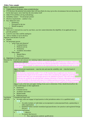 Ethics subject exam notes with case summaries, pre-written sentences, exam steps with exam tips and including colour coded legislation for barristers and solicitors and a list of every duty covered in the course (I recommend using this in the exam to check that you have not missed a duty and optimise marks) Topics: Week 1: introduction Week 2: admission to practice Week 3A: duty to obey the law Week 3B: duty to the court Week 4: the lawyer-client relationship Week 5: duties to client Week 6/7: Conflicts – lawyer/client, concurrent, successive Week 8: specific responsibilities in civil matters & criminal matters Week 9: Regulation of lawyers: trust accounting and coats Week 10/11: regulation of lawyers: complaints, disciplinary proceedings and sanctions, resilience in practice