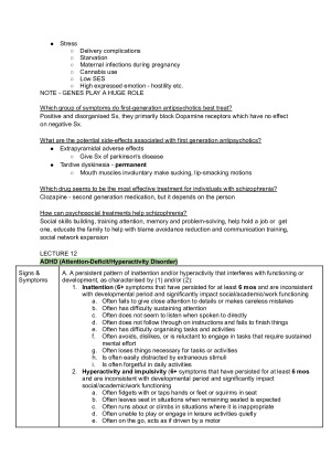 These notes are based off of all the most recent lecture outlines and are a full comprehensive summary of everything that was assessed within the unit. It also includes practice questions at the end of each topic. The topics include: - introduction to psychopathology (just a tiny bit from here) - Anxiety and related disorders - Mood disorders and suicide - Eating disorders and obesity - Sexual Dysfunction, Paraphilic Disorders, and Gender Dysphoria - Substance-Related and Addictive Disorders - Personality Disorders - Schizophrenia Spectrum and Other Psychotic Disorders - Neurodevelopmental Disorders