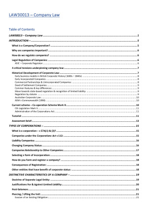 - Fully compiled & up-to-date Company Law notes - Comprehensive semester notes - Includes colour-coding system with headings & subheadings - Tutorial examples to help understanding of concepts and content - High Distinction notes - VERY detailed case analysis and summaries included - Includes all relevant case law & legislation - Easy to navigate and find things specific to what is needed in assessments - Clear notes - easy to follow