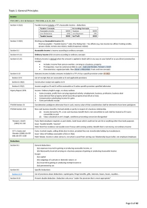 Topic 1 - General Principles Topic 2 = Income from personal services Topic 3 - Income from property Topic 4 - Income from a business Topic 5 - CGT Topic 6 - Allowable deductions Topic 7 - Taxation of Companies sand Shareholders Topic 8 Taxation of partnerships Topic 9 - Trusts and the taxation of Children Topic 10 - Returns, Assessment,s Topic 11 - Collection and recovery Topic 12 - General Anti-Avoidance Provisions