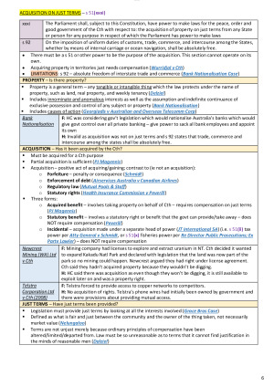 - Characterisation - Scope and Limitations - Executive Power, ch2 ss61-63 - Nationhood Power - s51(xxxix) & s61 - External Affairs Power s51(xxix) - Race Power s51(xxvi) - Acquisition on Just terms s51(xxxi) - Melbourne Corporation Doctrine - Cigamatic Doctrine - Federalism - Plenary Power - Trial by Jury - Implied freedom of political communication - Inconsistency s109 - Judicial Power ch3 - Remedies - S51(xx) Corporations - Trade within Cth s92 - Trade and commerce s51(i) - s51(ii) taxation, excise v tax - Appropriations - Powers of the Governor-General and GG in Council - The Dismissal and the 1975 Documents