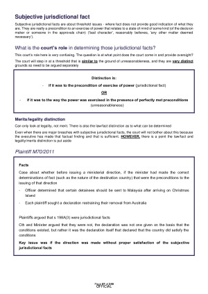 This initially started off as exam notes, but I thought that given how complicated and messy the UoM Admin course was, I decided to develop it into a complete course guide for students in the order you would use for an exam. You won’t even need to spend $200 on textbooks! Sectioned by topic groups, and then individual topics. Relevant legislation in every topic so no need to cross-reference multiple documents. Exam hypotheticals at the end too. Jurisdiction Merits/Legality distinction Jurisdiction of the court Potential remedies Standing Grounds - Procedural Fairness - Want of jurisdictional fact - Legal authority - Delegation - Relevant/irrelevant consideration - Inflexible application of policy - Unreasonable Jurisdictional/non-jurisdictional error - Jurisdictional error - Materiality - Non-jurisdictional error Consequences of breach Limitation devices - Privative clauses - No-invalidity clauses - Evidentiary limitation clauses Remedies - Mandamus - Prohibition - Certiorari - Equitable remedies Hypothetical structure for exam Essay issues Legislation