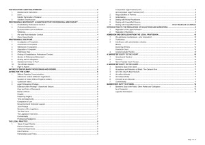 THE SOLICITOR-CLIENT RELATIONSHIP 1. Retainers and Instructions 2. Liens Solicitor Termination of Retainer 3. Solicitors Trust Account PROFESSIONAL MISCONDUCT & UNSATISFACTORY PROFESSIONAL MISCONDUCT 1. Unsatisfactory Professional Conduct 2. Professional Misconduct 3. Ignorance Alone can be Sufficient 4. Wilfulness 5. Pre- and Post-Admission Conduct 6. Show Cause Events PROFESSIONAL DISCIPLINE 1. Investigation of Complaints 2. Amendment of Complains 3. Withdrawal of Complaints 4. Disposition of Complaint 5. Preliminary View 6. Finding of Unsatisfactory Professional Conduct 7. Opinion of Professional Misconduct 8. Dealing with the Allegations 9. Standard and Onus of Proof 10. The Ultimate Question 11. Right to Appeal NATURE OF DISCIPLINARY PROCEEDINGS AND ORDERS ACTING FOR THE CLIENT 1. Without Prejudice Communications Admissions outside settlement negotiations Question of Costs (Without Prejudice Letters) 2. Calderbank letters 3. Legal Professional Privilege Extension of the Privilege – Search and Seizure Copy and Form of Documents Burden of Proof Illegality Displacing Illegality Time and Opportunity Compulsion of Law Government and Corporate Lawyers Joint Privilege Operation of the Legislature The Tide Turns The Legislature Intervenes Confidentiality Professional Negligence THE LEGAL PRACTICE 1. Types of Legal Practice Period of Supervision Authorised Supervisors Sole Practice Partnerships (Law Firms) Incorporated Legal Practices (ILP) Unincorporated Legal Practices (ULP) 2. Responsibilities of Partners 3. Undertakings 4. Dealing with Fellow Practitioners 5. Dealing with Unqualified Persons 6. Dealing with Unqualified Persons INTRODUCTION TO THE REGULATION OF SOLICITORS AND BARRISTERS 1. Regulation of the Legal Profession 2. Regulation of Barristers ADMISSION AND EXPULSION FROM THE LEGAL PROFESSION 1. Pre-admission nondisclosure - prior misconduct 2. Truthfulness 3. Interference with administration of justice Bribery Suborning Witness Conduct in Court 4. Conduct outside Practice A BARRISTER'S DUTY TO THE COURT 1. Honesty and Candour 2. Courtesy 3. Not to Frustrate Court Process A BARRISTER'S DUTY TO THE CLIENT 1. Barrister's Duty to the Client 2. Acceptance and Retention of Briefs: The Cabrank Rule 3. Act in the Client's Best Interests 4. Act within Authority 5. Act Independently 6. Immunity as an Advocate 7. Confidentiality BARRISTER’S DUTY TO OTHERS 1. Barrister's Duty to the Public, Other Parties and Colleagues 2. As a Prosecutor 3. Legal Aid Commission