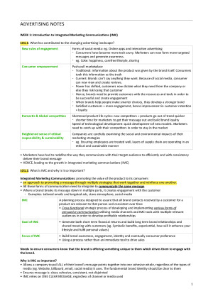 Summary from week 1 - 12 with relevant examples Week 1: Introduction Week 2: Communications Process Week 3: Influencing Consumer Behaviour Week 4-6: IMC strategic decisions Week 7-10: IMC Disciplines & Tools Week 11: Analytics and Measurement Week 12: Exam revision