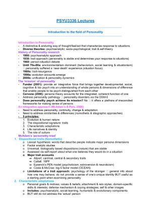 These are my notes for PSYU3336. This unit really excelled my knowledge in psychology and I really enjoyed this unit. Each Lecture has been summarised into the following weeks: Week 1: Introduction Week 2: Personality & Culture Week 3: Traits & Evolutionary Psychology Week 4: Personality Disorders & Culture Week 5: Persuasive Writing & Critical Thinking Week 5: Diversity and Resilience in Counselling Week 6: Trauma and Personality Disorders and Culture Week 7: Dissociative Identity Disorder & Culture Week 8: A Culture of Narcissim Week 9: Psychopathy & Culture Week 10: The Dark Triad and Popular Culture Week 11: Personality & Cyber-culture Week 12: Personality & transcending the self