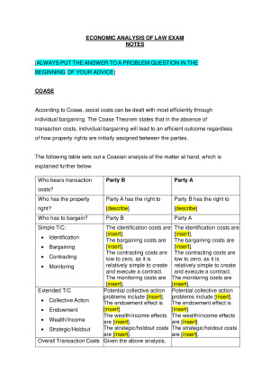 These notes provide a succinct, detailed exam scaffold that was extremely useful when completing the course's take home exam and any problem questions that came up during the course. The notes cover all topics for the most recent course curriculum of LAWS3335: Economic Analysis of Law. The following course topics are covered: - Coase - Calabresi and Melamed - Viscusi - Public Choice Theory (including Textualism vs Purposivism. Easterbrook and Farber and Frickey) - Asymmetric Information and Signalling For best results pair with the other set of notes that cover all course theory concepts in detail.