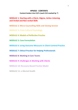 -Valuable resource for the two open-book quizzes and all assignments -Comprehensive summary of ALL modules weeks 1-11 -Modules broken down into core learning objectives (clearly marked with * and colour coded) -Includes notes based on seminar activities and tips given from seminar tutor (attended ALL seminars) TOPICS INCLUDED: MODULE 1: Starting with a Client, Stigma, Active Listening and Verbal and Non-verbal Skills MODULE 2: Micro-Counselling Skills and Closing Session MODULE 3: Cross-Cultural Psychology MODULE 4: Models of Reflective Practice MODULE 5: Case Formulation MODULE 6: Using Outcome Measures in Client-Centred Practice MODULE 7: Ethical Practice for Helping Professionals MODULE 8: Working in Care Teams MODULE 9: Challenges in Working with Clients MODULE 10: Recovery-Based Practice Model MODULE 11: e-Mental Health Good luck with the unit!