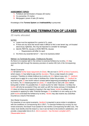 Real Property Final Exam Scaffolds. Covers three topics: 1. Forfeiture and termination of leases 2. Co-ownership 3. Mortgageeās power of sale Includes knowledge of Torrens System and Indefeasibility.