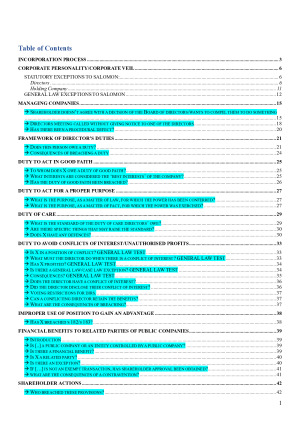 I used these notes to complete the three hypothetical questions in the exam. Topics in these notes include: -incorporation process -corporate personality/corporate veil -managing companies -framework of director's duties -duty to act in good faith -duty to act for a proper purpose -duty of care -duty to avoid conflicts of interests/make an unauthorised profit -improper use of position to gain an advantage -financial benefits to related parties of public companies -shareholder actions -corporate liability -share capital