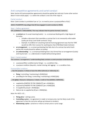 These HD notes cover all the topics found in LAW4702 Competition and Consumer Law at Monash University and are up to date as of Semester 2, 2023. They have been made as clear and succinct as possible for use during exams and feature pre-written scripts for every section of every topic to help get you started on any given problem question. I've also included useful, pre-written analogies for all the most important cases. Topics include: - Consumer guarantees - Unfair contract terms - Unconscionable conduct - Misleading or deceptive conduct - Markets, market power and competition - Mergers - Misuse of market power - Anti-competitive agreements and cartel conduct - Exclusive dealings - Resale price maintenance - Authorisation, penalties & remedies