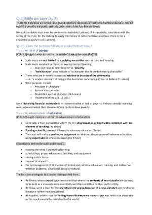These HD notes cover all the topics found in LAW4170 Trusts at Monash University and are up to date as of Semester 2, 2023. They have been made as clear and succinct as possible for use during exams and feature pre-written scripts for every section of every topic to help get you started on any given problem question. I've also included useful, pre-written analogies for all the most important cases. Topics include: - Certainty of intention - Certainty of subject matter - Certainty of object - Constitution of the trust - Statutory writing formalities - Charitable purpose trusts - Quistclose trusts - Trustee duties - Defences and limitations on liability - Rights of trustees - Rights of beneficiaries - Remedies