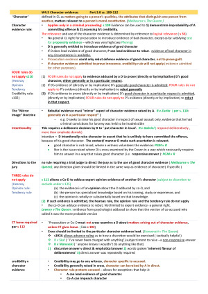 These notes are a concise yet comprehensive summary of week 1-5 contents of rules of Evidence. The notes are structed in a clear and logical way to serve as a quick reference for mid-term assessment. As only limited pages of reference materials are allowed ( 10pages ), these notes ( 9 pages in total) will save you huge amount of time in compiling your own. These notes also help with revision for final exam. I achieved 85 for mid-term exam, and a high-end Distinction for this subject ( 84). Topics covered include: • General rules of Admissibility and Burden of Proof • Judicial Notes and Presumptions • Rules of examining evidence • Silence of the accused and Adverse inference • Court’s power to control the proceedings • Witness’s competency and compellability • Rules of questioning witness • Credibility rules • Character evidence rules • Rules of Admission