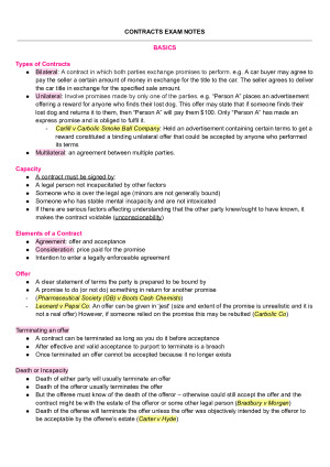 - Basics (types of contracts, capacity, elements) - Privity (reform, estoppel) - Vitiating factors (duress, undue influence, statutory controls) Constructing contracts (terms, oral statements) - Performance/Termination - Remedies - Damages - Case law