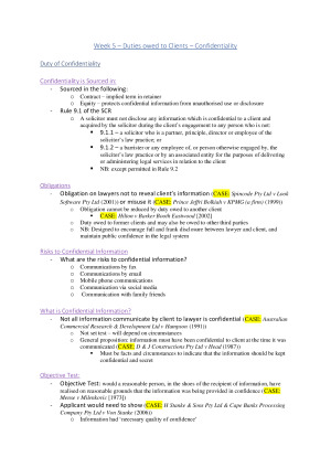 Week 1 - Ethics and Mortality in the legal profession Week 2 - Admission to Practice Week 3 - Retainer, Competence, Lawyer/Client Week 4 - Conflicts of Interest Week 5 - Confidentiality Week 6 - Duty to Account and Costs Week 7 - Administration of Justice Week 8 - Witnesses, Prosecution, Lawyers and Criminal Defence Week 9 - Duties owed to the Profession and Others Week 10 - Complaints and Discipline