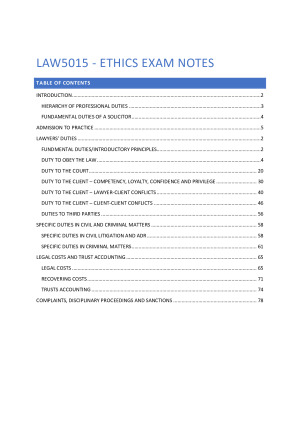 Taken in T3 2023 Used these notes in the exam to get a 80% overall mark, 86% on the exam Includes comprehensive case summaries for class as well Topics covered: Introduction Hierarchy of professional duties Fundamental duties of a solicitor Admission to practice Lawyers’ duties Fundmental duties/introductory principles Duty to obey the law Duty to the court Duty to the client – competency, loyalty, confidence and privilege Duty to the client – lawyer-client conflicts Duty to the client – client-client conflicts Duties to third parties Specific duties in civil and criminal matters Specific duties in civil litigation and adr Specific duties in criminal matters Legal costs and trust accounting Legal costs Recovering costs Trusts accounting Complaints, disciplinary proceedings and sanctions