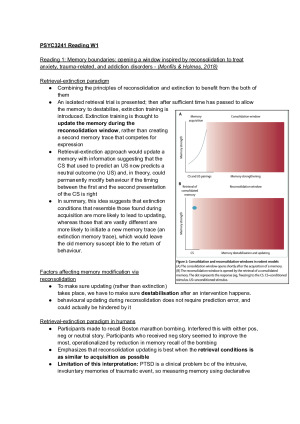 PSYC3241 extra reading summaries covering the following papers: - The Expression of Fear-Potentiated Startle During Development: Integration of Learning and Response Systems Robert C. Barnet and Pamela S. Hunt - Infantile amnesia: A neurogenic hypothesis by Sheena A. Josselyn & Paul W. Frankland - Switching on and off fear by distinct neuronal circuits - Herry et al. (2008) - Opposite effects of fear conditioning and extinction on dendritic spine remodelling - Lai et al. (2012) - Reading 1: Memory boundaries: opening a window inspired by reconsolidation to treat anxiety, trauma-related, and addiction disorders - (Monfils & Holmes, 2018)