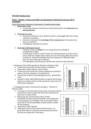 PSYC3051 additional reading notes/summaries covering: - Actions and habits: the development of behavioural autonomy BY A. DICKINSON - Holland (2005) - Amount of training effects in representation-mediated food aversion learning: no evidence for a role for associability changes - Rescorla (1967) - Control procedures - Pavlovian-instrumental transfer (Corbit et al., 2007) - Effects of amount of training & devaluation on PIT (Holland, 2004) - Conditioned reinforcement (Parkinson et al.,2007) - Extinction of goal tracking eliminates CDR of appetitive CS - Keams et al. (2012)