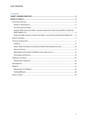 These notes cover required readings and every module! They are a MUST if you do not have the time to compile notes yourself !! Attached is a sample of the notes regarding Evidence. **Note** : in a few of the earlier modules, i had begun to copy paste the UCPR rules directly into my notes. Due to the time consuming nature of the task, in the later modules i only refer to the UCPR rules by number. I found it less time consuming and more helpful to have a word version of the UCPR open :) Topics: Introduction Access to Justice, Open Justice and Client Care ADR, Jurisdiction, Limitation Perios Initiating Proceedings, Commencing Litigation, Joining Parties, Drafting Pleadings Service Evidence Interlocutory Applications and Injunctions Costs Settlement Strike-out, Summary Disposal, Vexatious Litigants Enforcing Judgements Appeals