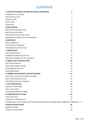 These are my fully comprehensive detailed notes for MLL228 (Revised for 2024). This is all I used for the exam. I have spent countless hours compiling these notes. My mark was 93 HD for the subject. I scored 100% in the exam using only these notes. These notes are comprehensive and integrate everything learnt in the subject, including the prescribed readings from the textbook, lecture notes, tutorial answers, case summaries, etc. These notes also include exam templates and summary flow charts (including a full summary exam template section which can be used in the exam alone) which is shown at the end of the sample of the notes. These notes cover the following topics: - Introduction to ADR - ADR in Australia - Negotiation - Mediation - Arbitration - Family Dispute Resolution - Criminal Restorative Justice Programs - Australian Financial Complaints Authority - ADR in Health Care - Confidentiality in ADR Processes Hope these comprehensive help you smash Alternative Dispute Resolution!