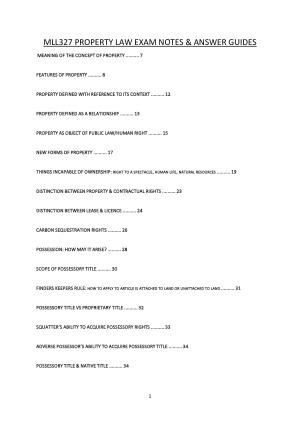These are my fully comprehensive detailed notes for MLL327 / MLP327 (Revised for 2024). This is all I used for the exam. I have spent countless hours compiling these notes. My mark was 90 HD for the subject. I scored 95% in the exam using only these notes. These notes are comprehensive and integrate everything learnt in the subject, including the prescribed readings from the textbook, lecture notes, tutorial answers, case summaries, etc. Please see my accompanying exam guide for a more step-by-step approach to answering property law exam questions shown in the sample notes. These notes cover the following topics: - 1 CONCEPT & CATEGORIES OF PROPERTY - 2 PERSONAL PROPERTY, POSSESSION & FIXTURES - 3 ADVERSE POSSESSION - 4 DOCTRINE OF TENURE - 5 NATIVE TITLE - 6 FREEHOLD ESTATES - 7 LEASES - 8 EQUITABLE PROPERTY - 9 EASEMENTS - 10 RESTRICTIVE COVENANTS OVER LAND - 11 MORTGAGES Hope these comprehensive notes help you smash Property Law!
