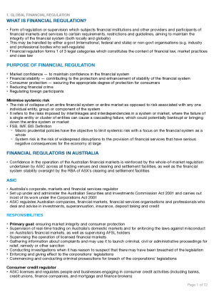 These are my fully comprehensive detailed notes for MLL329 Financial Services Regulation (Revised for 2024). This is all I used for the exam. I have spent countless hours compiling these notes. My mark was 92 HD for the subject. I scored 91% in the exam using only these notes. These notes are comprehensive and integrate everything learnt in the subject, including the prescribed readings from the textbook, lecture notes, tutorial answers, case summaries, etc which I have summarised into concise and easy to follow step-by-step guide to answer evidence exam questions. These notes cover the following topics: 1. Global Financial Regulation 2. Financial Markets and Services 3. Financial Regulatory System 4. Australian Financial Regulatory Authorities 5. Payments, Clearing, Settlement Systems 6. Australian Financial Market Licence 7. Financial Products Advice 8. Financial Dispute Resolution 9. Disclosure in Financial Services 10. Financial Services Regulation Revision Hope these comprehensive notes help you smash Financial Services Regulation!