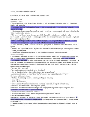 These notes cover all the assessable topics in ATS2496 and contain material from every lecture, reading and tutorial as well as external resources (additional books from the library). When using these notes, I felt very comfortable answering the quiz questions and they provided the basis for my major essay. Week 1: Introduction to victimology Week 2: Measuring victimisation Week 3: The ideal victim Week 4: Theories of victimisation Week 5: The role of victims in adversarial trials Week 6: Victim impact Week 7: Victim's rights and restorative justice Week 10: Cyber fraud