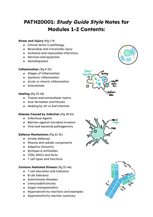 The perfect study companion for your Path20001 :) Contains all examinable content from lectures, tutorials and readings in a summarised format alongside simplified diagrams (see sample) from modules 1-2 (weeks 1-7) of Path20001. These are not just my lecture notes -> this is a personalised study guide that I created after completing the subject in 2023 (score: 95/100). I hand-drew all diagrams to make the content digestible and wrote the notes to include all details needed to score in the highest band without overwhelming you with unnecessary information. Don't waste anymore time deciphering textbooks or searching through confusing diagrams! Topics covered: . Stress and injury . Reversible and irreversible injury . Haematopoiesis . Necrosis and apoptosis . Inflammation . Healing . Disease caused by infection . Defence mechanisms . Immune mediated disease . Tutorials 1-6 (Injury, Inflammation, Healing, Infection, Immunity #1 and #2)