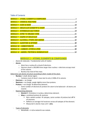 Notes cover all the content throughout the whole semester (week 1 to week 13). It is colour coded which makes it easy to follow and differentiate concepts that sound similar but are different. It saves so much time to use these notes for the completion of the workshops and to study for the final exam. I got an overall mark of 90% in the unit with these notes. Contents: Module 1 – atoms, elements & compounds Module 2 – chemical reactions Module 3 – acids & bases Module 4 – molecular geometry & shape Module 5 – intermolecular forces Module 6 – introduction to organic chemistry Module 7 – shapes of molecules Module 8 – alcohols, ethers and amines Module 9 – aldehydes & ketones Module 10 – carbohydrates Module 11 – carboxy, esters & lipids Module 12 – amides, proteins & biomolecules
