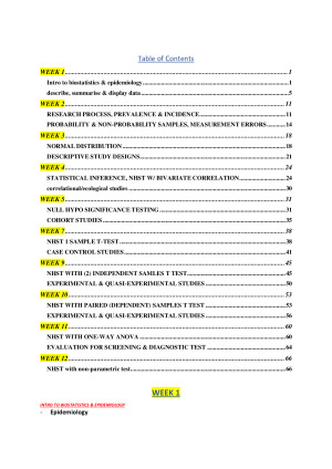 Very organised lecture notes covering Week 1 to Week 12 for Biostatistics and Epidemiology. These notes cover a wide range of topics and explain them in a very simple way so it is useful to understand complex topics. Topics covered include: - Week 1: Intro to Biostatistics & Epidemiology, Describe, Summarise & Display Data - Week 2: Research Process, Prevalence & Incidence, Probability & Non-Probability Samples, Measurement Errors - Week 3: Normal Distribution, Descriptive Study Designs - Week 4: Statistical Inference, NHST w/ Bivariate Correlation, Correlational/Ecological Studies - Week 5: Null Hypo Significance Testing, Cohort Studies - Week 7: NHST 1 Sample T-Test, Case Control Studies - Week 9: NHST with (2) Independent Samples T Test, Experimental & Quasi-Experimental Studies - Week 10: NHST with Paired (Dependent) Samples T Test, Experimental & Quasi-Experimental Studies - Week 11: NHST with One-Way ANOVA, Evaluation for Screening & Diagnostic Test - Week 12: NHST with Non-Parametric Test These notes are what I used to guide myself around the unit, they helped me to understand the topics when I had no background in maths or statistics. It has some tables made up from the examples given and formulas (better tool for visual learners) and step by step explanations on what to include in descriptions with guided examples.