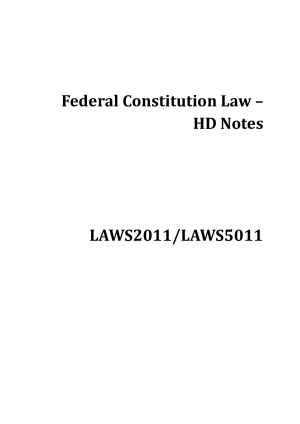 These are extremely comprehensive LAWS2011/5011 Federal Constitutional Law Notes that can be used for the final exam (this is what I did). It includes all the key takeaways of cases and readings, so easy to follow during class and exams. All key points are highlighted and well organized by topics. I achieved an overall High Distinction (88%) in FedCon using these notes - they are the BEST that includes every important cases and quote, SUPER USEFUL for exams. Topics covered: Topic A: Principles of Constitutional Law/ Trade & Commerce Power Topic B: Inconsistency Topic C: External Affairs Power Topic D: Corporations Power Topic E: Freedom of Interstate Trade Topic F: Taxation and Grants Topic G: Defence Power Topic H: Implied Freedom of Political Communication Topic I: Intergovernmental Immunities