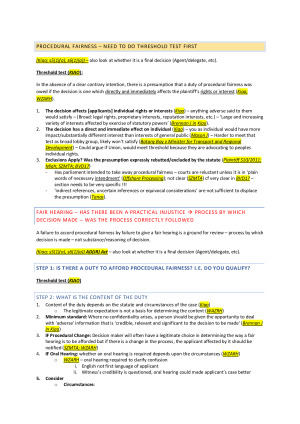 This set of notes covers all examinable topics and provides structural skeletons for answering problem exam questions. The notes cover the topics sequentially to allow for optimal efficiency in answering questions: - Jurisdiction - Standing - Grounds for review (including; fact finding errors, acting without power, procedural fairness, errors in the exercise of discretion, fettering discretion and policies, unreasonableness, irrationality and illogicality) - Jurisdictional error / non-jurisdictional error - Statutory restrictions - Remedies